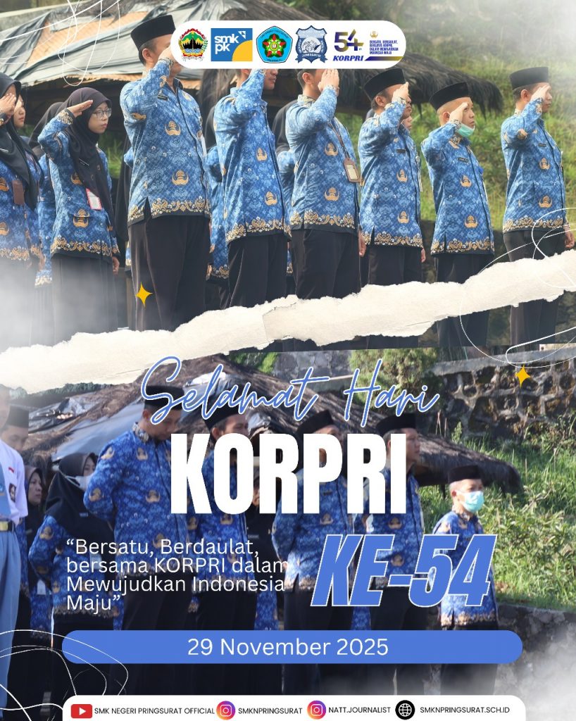 SMK Negeri Pringsurat — menyelenggarakan Upacara Bendera dalam rangka memperingati Hari Ulang Tahun ke-54 KORPRI pada Senin, 1 Desember 2025. Upacara yang digelar pada pukul 06.45–07.45 di Lapangan Upacara ini dilaksanakan di sela-sela hari terakhir Penilaian Sumatif Akhir Semester (PSAS), tanpa mengurangi kekhidmatan dan makna peringatannya.